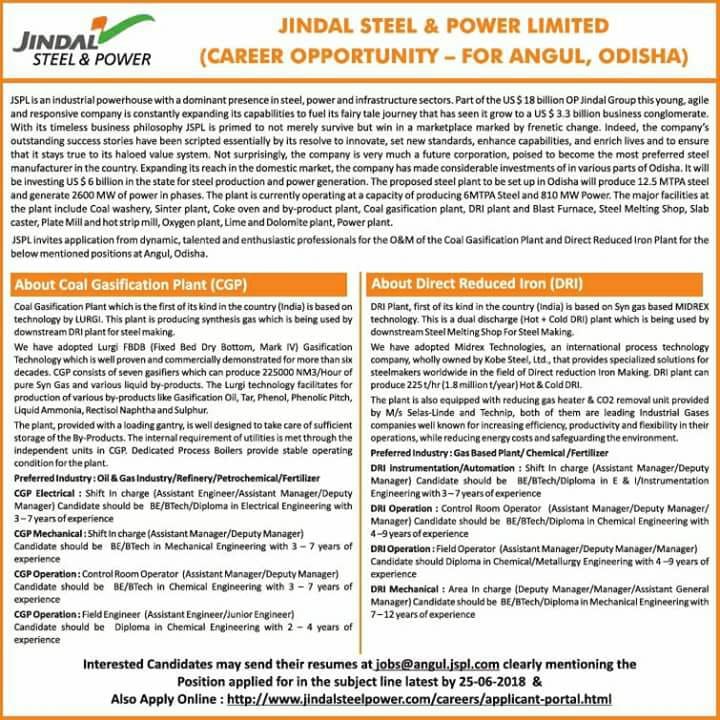 Jindal steel and power limited jspl has opened various job openings for posts of engineer mechanical battery process cobpp shift in charge control room operator field engineer panel operator various jobs.