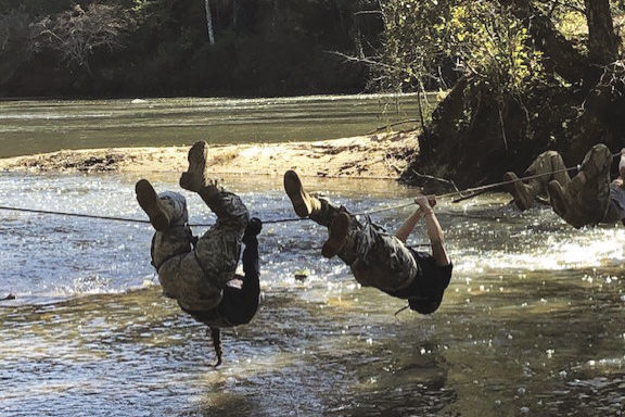 The one rope bridge is an event in the raider competition in which two cadets securely tie a single rope across a river.