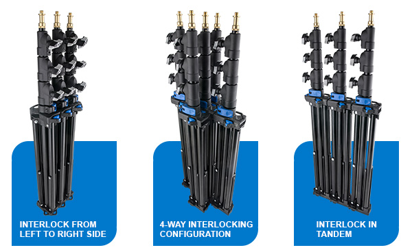 The stand features a unique four way interlocking design that allows it to click or un click from a bundle of four and can be carried with an optional shoulder strap.