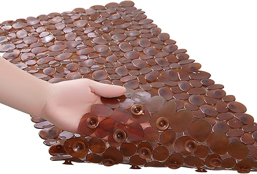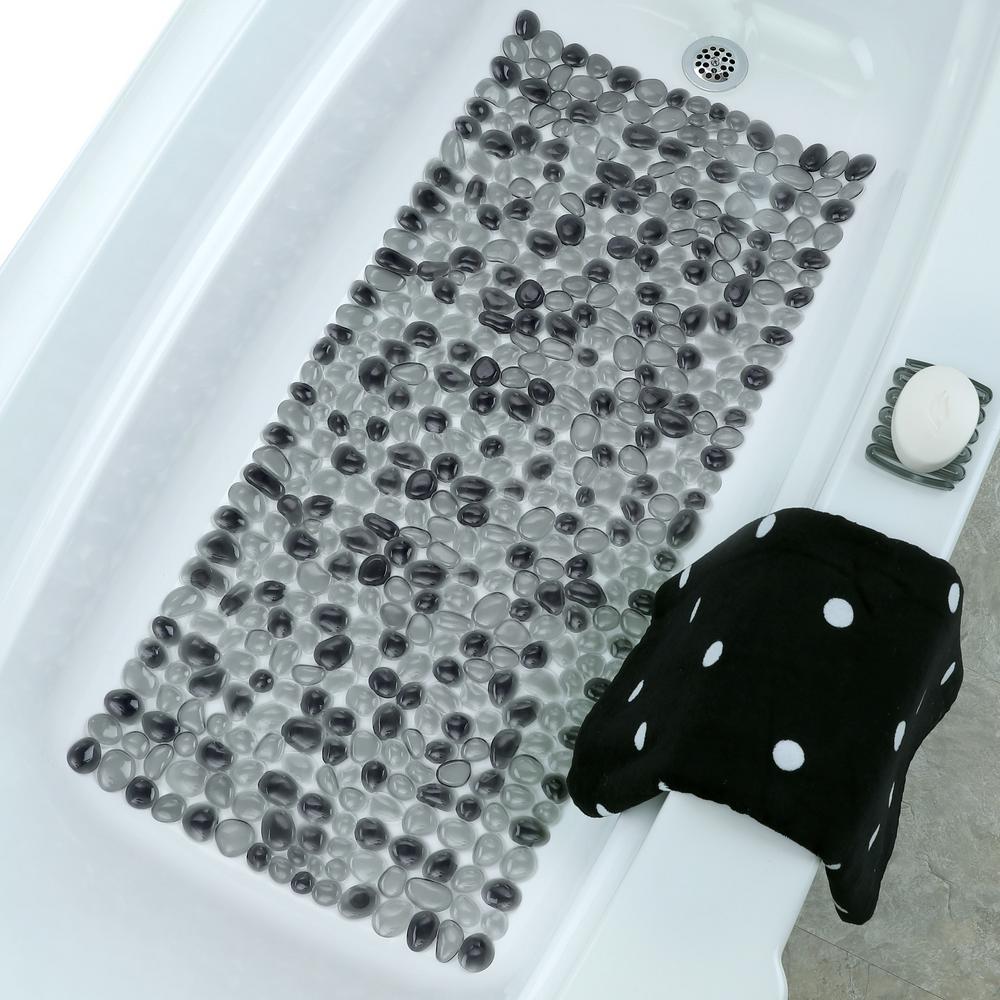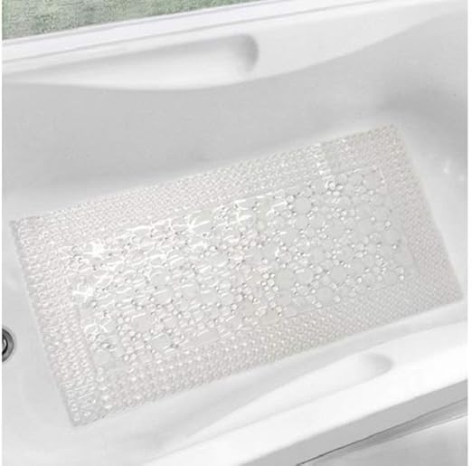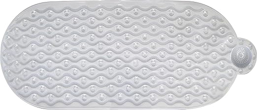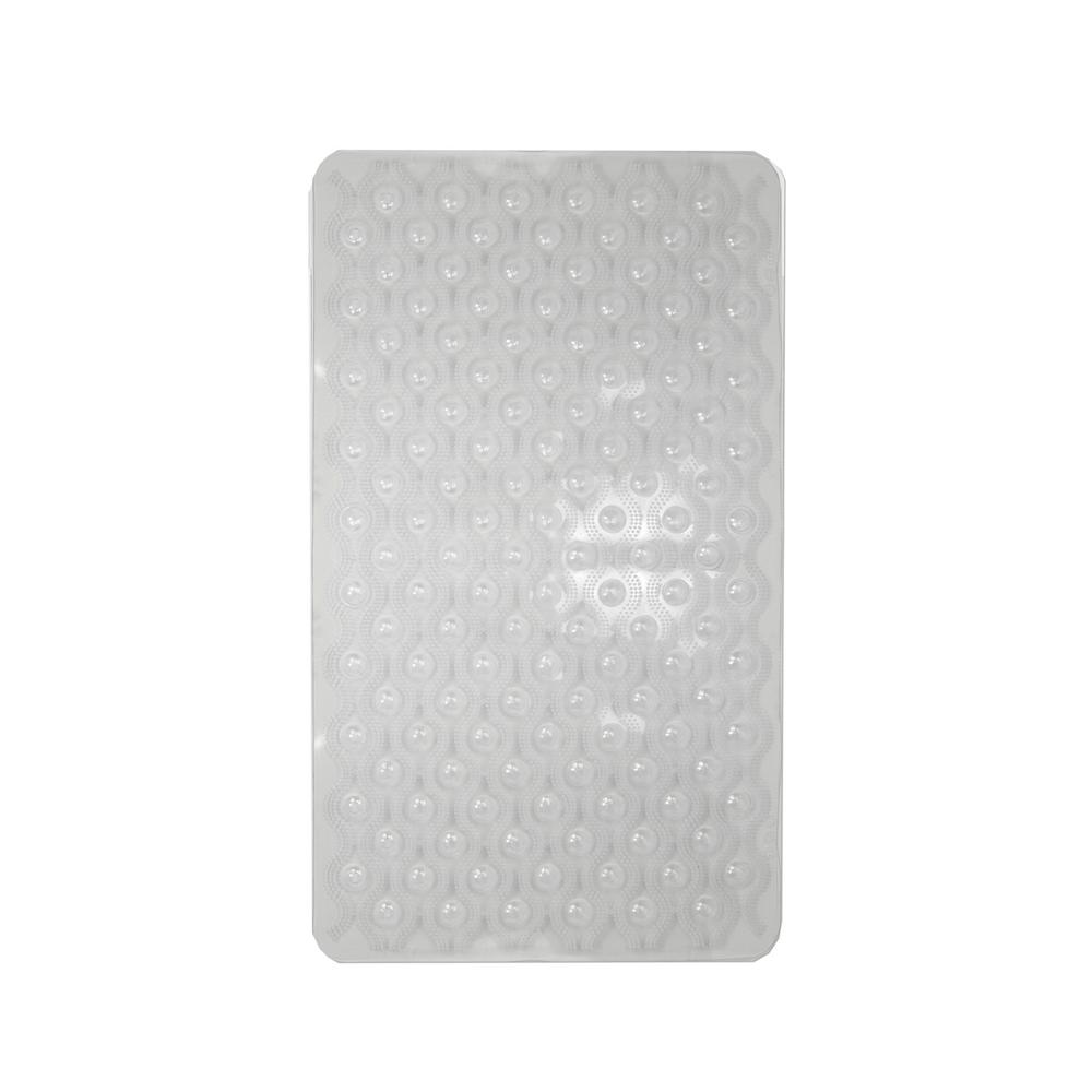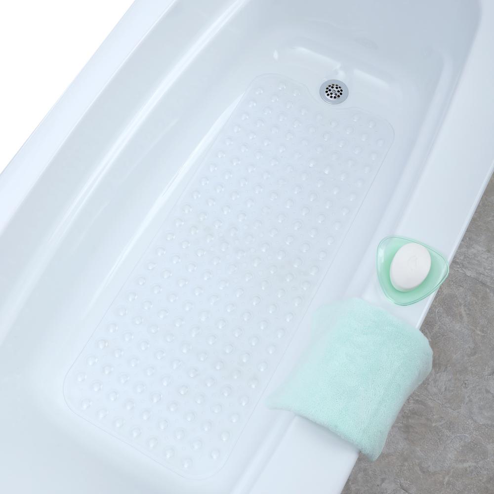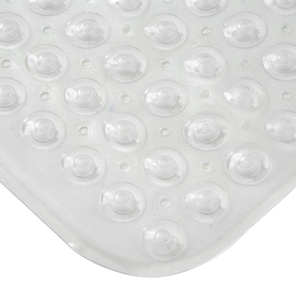 This clear bath mat is made of durable vinyl and features over 200 suction cups to provide reliable non slip protection.